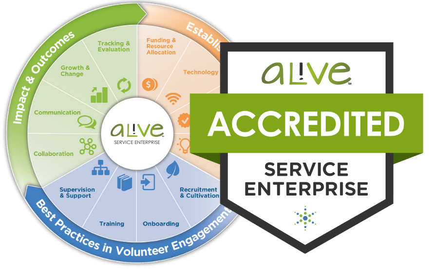 Service Enterprise is the nation's premiere organizational accreditation recognizing commitment to strategic volunteer engagement that provides comprehensive diagnostic assessments, customized training, and resources proven to enhance efficiency, build capacity and increase impact. AL!VE's goal is to strengthen the capacity of organizations to strategically and effectively engage volunteers to address organizational and community needs.